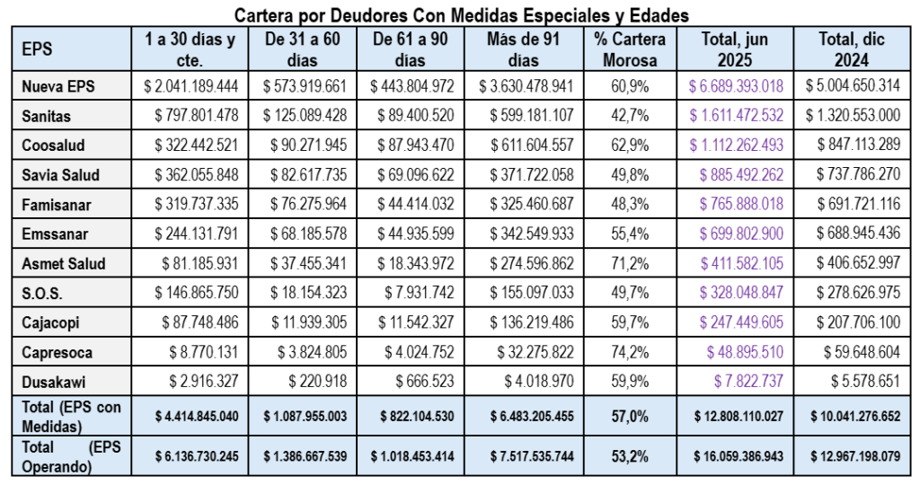 La EPS que tuvo un mayor incremento absoluto en su cartera total, entre diciembre de 2024 y junio de 2025, fue Nueva EPS (ambos regímenes) con cerca de 1,7 billones de pesos, lo que representa un incremento del 33,7%. Las siguientes EPS con mayor incremento absoluto en su cartera total son Sanitas con un incremento de más de 290 mil millones de pesos (22,0%) y Coosalud (ambos regímenes) con un incremento de más de 265 mil millones de pesos (31,3%). Estas tres EPS concentran 81,0% del crecimiento de más de 2,2 billones de pesos entre diciembre de 2024 y junio de 2025, en la cartera total del grupo de 11 EPS con medidas especiales interpuestas por la Superintendencia Nacional de Salud.