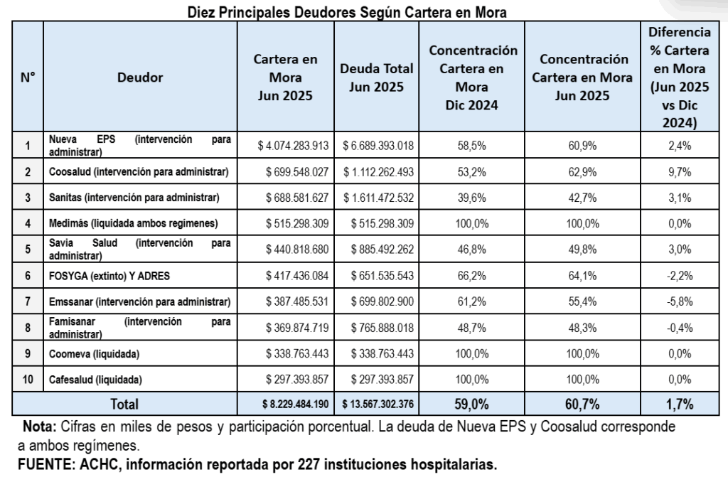 Al ordenar por mayor valor absoluto de cartera en mora , la principal EPS deudora sigue siendo Nueva EPS (ambos regímenes), seguida de Coosalud (ambos regímenes), luego aparecen las deudas de Sanitas, Medimás, Savia Salud, la ADRES y el extinto FOSYGA, Emssanar, Famisanar, Coomeva y Cafesalud que tienen en conjunto una deuda total de más de 13,5 billones de pesos y una cartera morosa cercana a los 8,3 billones de pesos, es decir, una concentración de cartera morosa en su conjunto de 60,7%, que resulta superior en 1,7 puntos porcentuales frente a los 59,0% a diciembre de 2024.