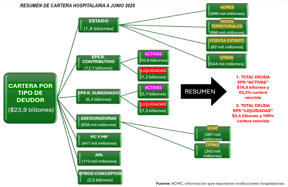 Bogotá, Septiembre de 2025. En el estudio de cartera hospitalaria número 54 elaborado por la ACHC tras 27 años ininterrumpidos, se evidenció que con corte a junio de 2025 a las 227 Instituciones que reportan información, les adeudan un total cercano a 24 billones de pesos, con un incremento de 18,4% en el monto absoluto de cartera total respecto a diciembre de 2024, porcentaje que representa más de 3,7 billones de pesos entre diciembre de 2024 y junio de 2025.